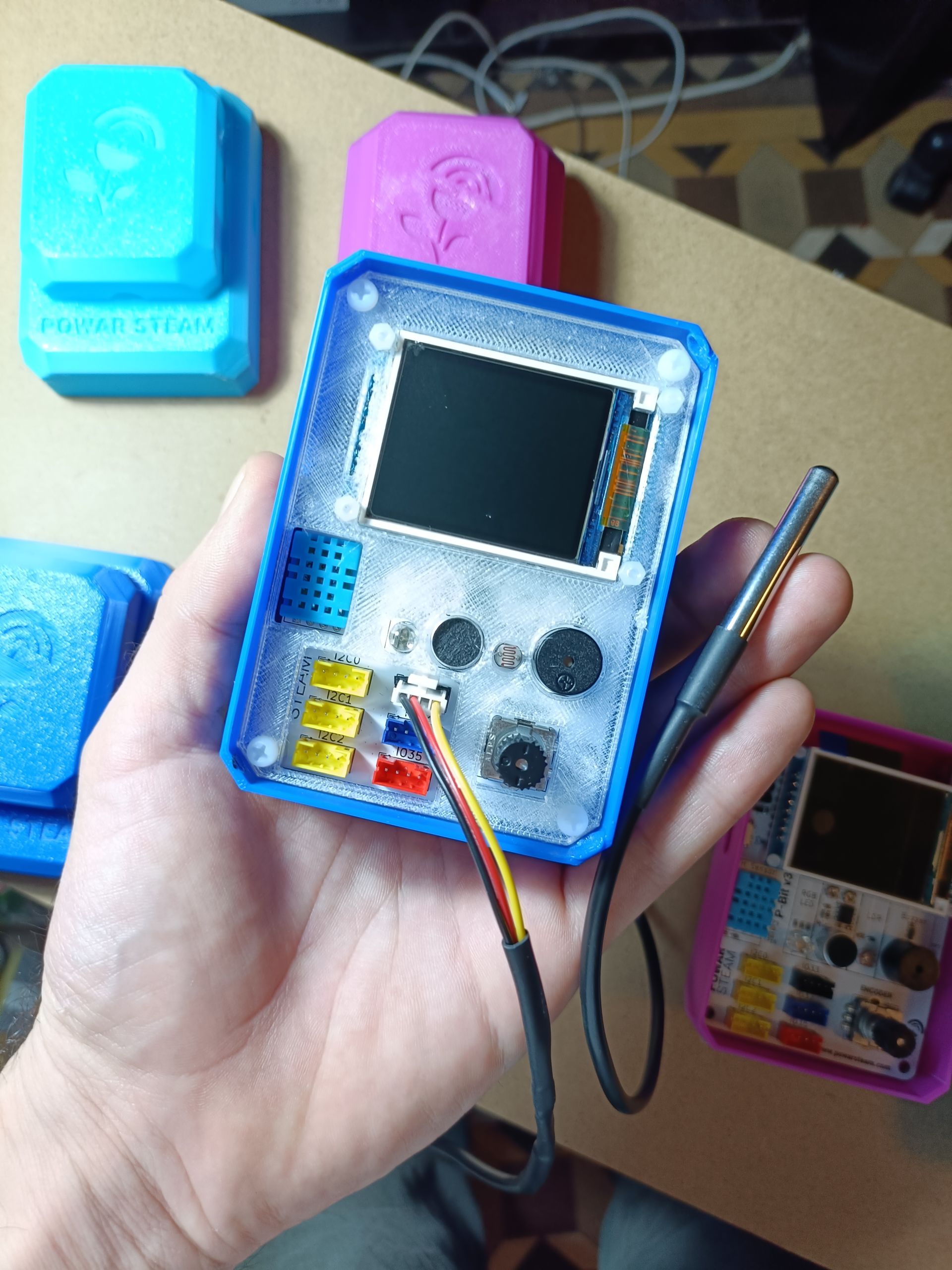 Este dispositivo compacto integra varios sensores ambientales y componentes interactivos, permitiendo la recopilación de datos ambientales de manera sencilla y práctica.